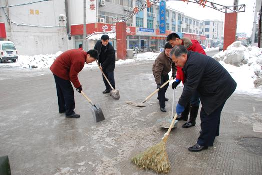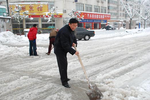 1月28日、2月2日上午,政协领导朱从云(上图右一)、张春山(下图)、薛晨光(上图左一)带领政协机关全体人员在中心大道华泰新村路口破冰除雪。